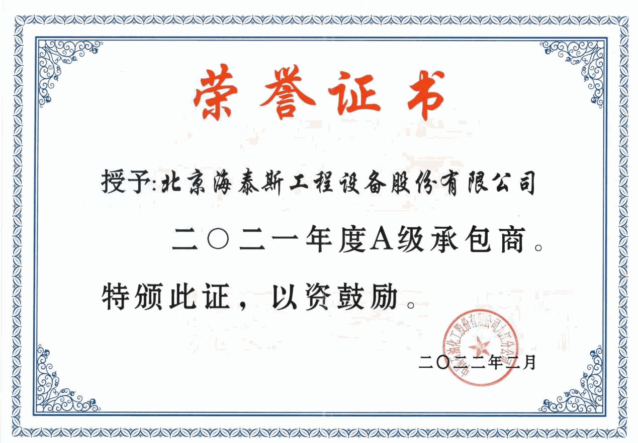 海泰斯為優(yōu)質客戶提供的法蘭連接密封完整性管理方案及工程技術服務, 被授予“二0二一年度A級承包商”榮譽稱號。