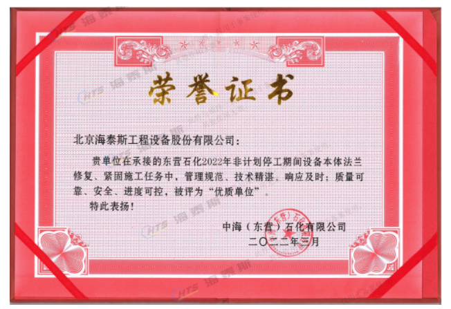 海泰斯獲評“優(yōu)質單位”!負責的催化裝置、常減壓裝置泄漏法蘭的在線修復和定力矩緊固施工任務,實現了“零泄漏”的目標。